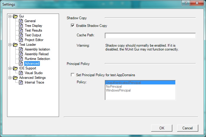 NUnit normally uses .Net shadow-copying in order to allow you to edit and recompile assemblies while it is running. Uncheck this box to disable shadow-copy only if you have a particular problem that requires it.