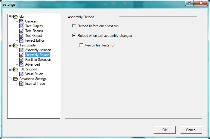 If Reload when test assembly changes is checked, assemblies are watched for any change and an automatic reload is initiated. This item is disabled on Windows 98 or ME.