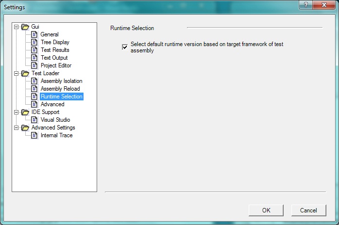 If Select default runtime... is checked, NUnit will examine each test assembly and try to use the runtime for which it was built to load it. If left unchecked, NUnit will use the current runtime to load the assembly.