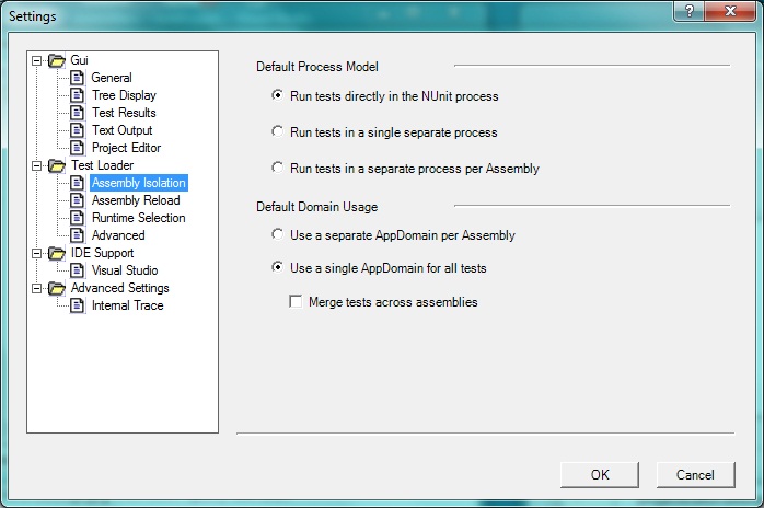 If Run tests directly in the NUnit process is selected, all tests are run in a test domain in the same process as NUnit. This is the way previous versions of NUnit ran tests and is the default setting.